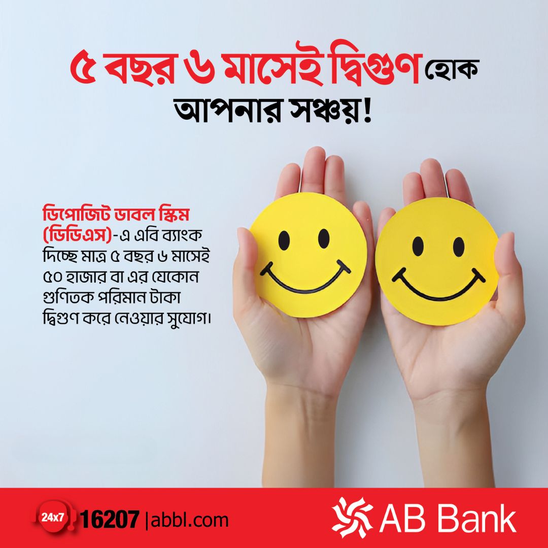 বিশেষ এফডিআর স্কিমের মাধ্যমে মাত্র ৫ বছর ৬ মাসে আপনার জমা করা টাকা হয়ে যাবে দ্বিগুণ। উচ্চ মুনাফা, ঝুঁকিমুক্ত বিনিয়োগ এবং বিশ্বস্ত AB ব্যাংক-এর সরাসরি এজেন্ট হিসেবে আমরা দিচ্ছি ১০০% নির্ভরযোগ্যতা।